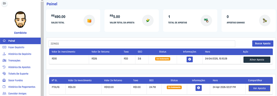 apostador encontrará em seu painel de apostador para eventuais chamados