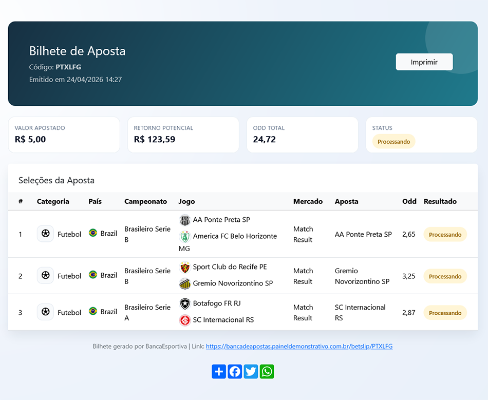- Com este recurso você poder´imprimir ou compartilhar suas apostas