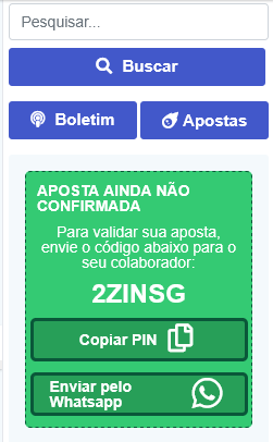 Validação de PIN e/ou Aposta pelo Cambista - Após o Cambista receber o PIN do apostador por um dos meios de compartilhamento escolhido pelo apostador, ele se loga na plataforma pelo site ou pelo APP, vai na opção BUSCAR APOSTA e valida o código PIN em seu painel registrando e validando a aposta, de uma forma simples e rápida em 3 cliques.