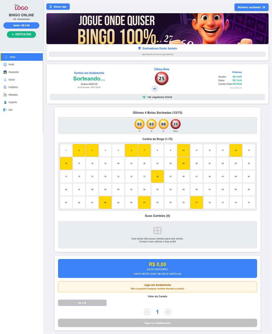 ganhar muitos prêmios. Inicie agora sua plataforma online de bingo com os principais módulos inclusos de Afiliados e Impressão de Cartelas.
